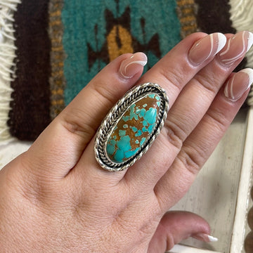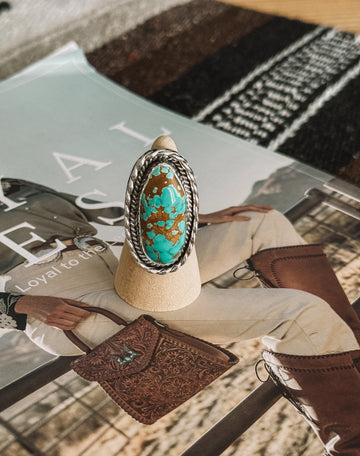 The western Navajo Turquoise Oval Ring is a sweet addition to any jewelry collection. Handcrafted by a skilled silversmith, this sterling silver ring features a stunning turquoise oval measuring 1 5/8 inches long and 1 inch wide. With a unique design and affordable price, it's a perfect blend of craftsmanship and value.
