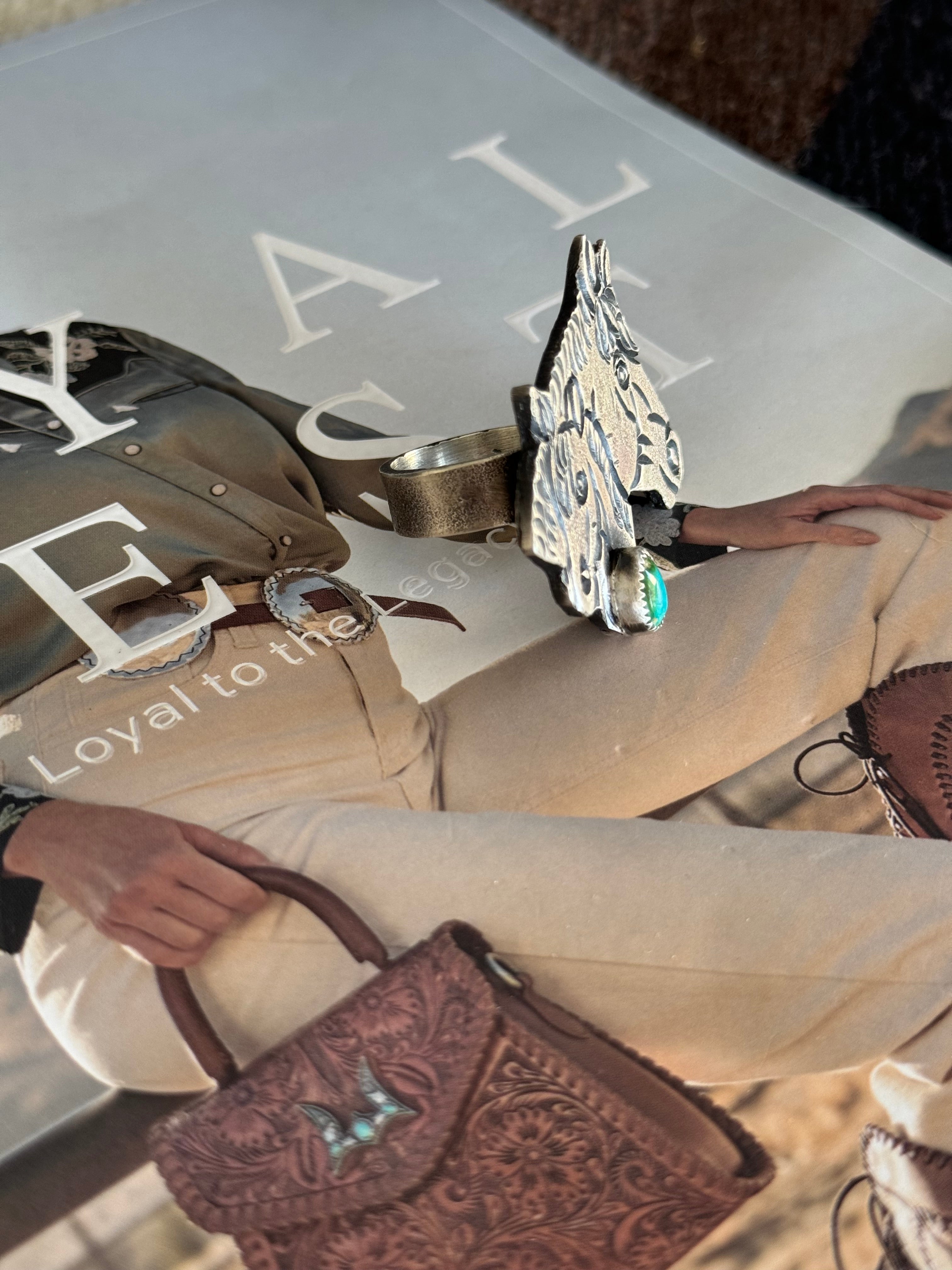For the cowgirl who carries the spirit of the horse with her everywhere. The Sterling Equine Ring is handcrafted in sterling silver and features two detailed horse heads paired with a genuine teardrop turquoise stone. Bold yet elegant, it’s the kind of piece that makes a statement whether you’re at the rodeo, in the saddle, or just out on the town. With its adjustable band, this beauty is made to fit you perfectly.