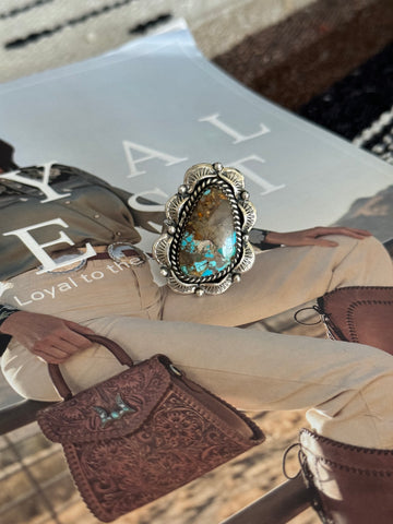 This stunning adjustable ring features gorgeous handmade natural Royston Turquoise and sterling silver. Crafted with beautiful attention to detail, this ring is not only adjustable to fit any finger but also stamped sterling and signed by Nizhoni Traders, ensuring its authenticity. Elevate your style with this western-inspired accessory.