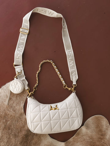 The Loyal Quilted Nappa Leather Bag in white blends classic western tones with high-end, city-chic appeal. Made from buttery soft nappa leather with a diamond quilted finish, this bag features two luxe looks in one: a bold gold chain strap and an adjustable Loyal West logo canvas strap with matching coin pouch. Inside, rich burgundy lining and practical pockets keep your essentials tucked away in style.