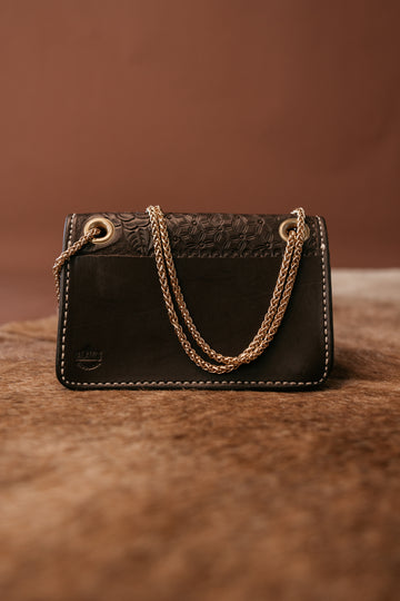 This hand tooled bag features an adjustable designer chain. Available in chocolate leather with gold hardware & natural leather with silver hardware. Measures 7" x 3.25" with 9.5 adjustable designer chain. You have the option to have a short chain or long chain when wearing this. These are NFR APPROVED! With its clear material on the sides and the bottom of this clutch!