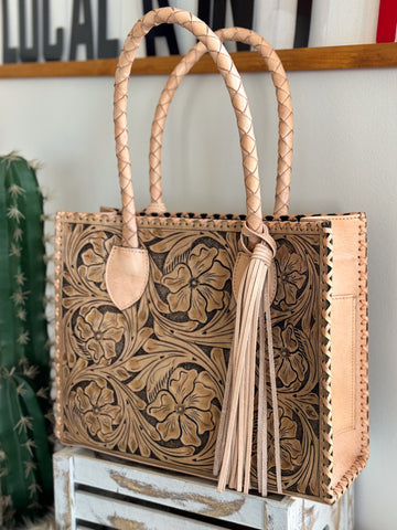 This stunning tote bag is a testament to artisanal craftsmanship and the natural beauty of full-grain leather. Handcrafted in Mexico, the Marcos Tote in Natural features exquisite hand-tooled details, braided shoulder straps, and playful fringe tassels. With its spacious interior and convenient pockets, it's as practical as it is stylish.