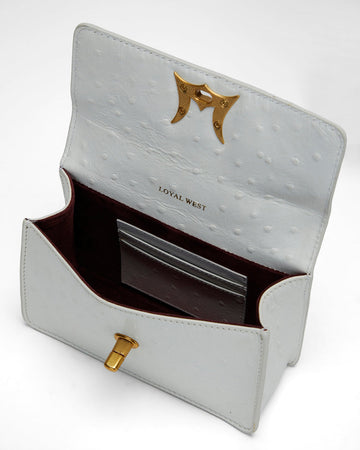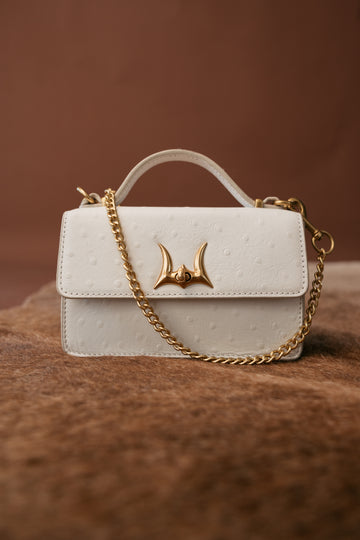 Meet the Valencia Ostrich Leather Bag – where rugged charm meets high-end detail. This crisp white mini purse is crafted from premium ostrich-textured leather with a structured silhouette, soft suede lining, and built-in card slots for easy organization. The standout? A signature gold longhorn clasp and gleaming chain strap for a touch of cowgirl glam.
