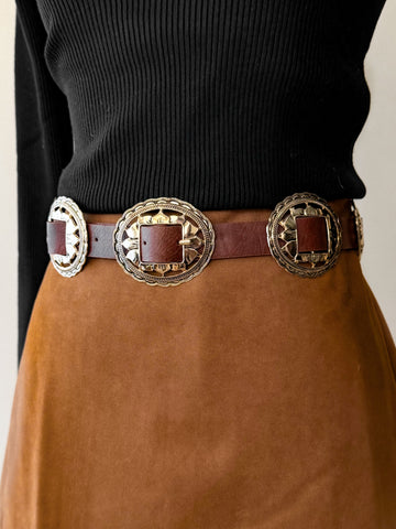 • Cognac faux-leather link belt with silver-tone sunflower conchos