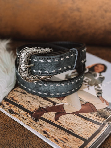 Expertly crafted from black genuine leather, our Buck Stitched Leather Belt features intricate buck stitching detail and a western vintage buckle. The 2-3/4" x 3" buckle and 1-1/2" width make it the perfect statement piece for any outfit. Elevate your look with this timeless and stylish accessory.