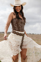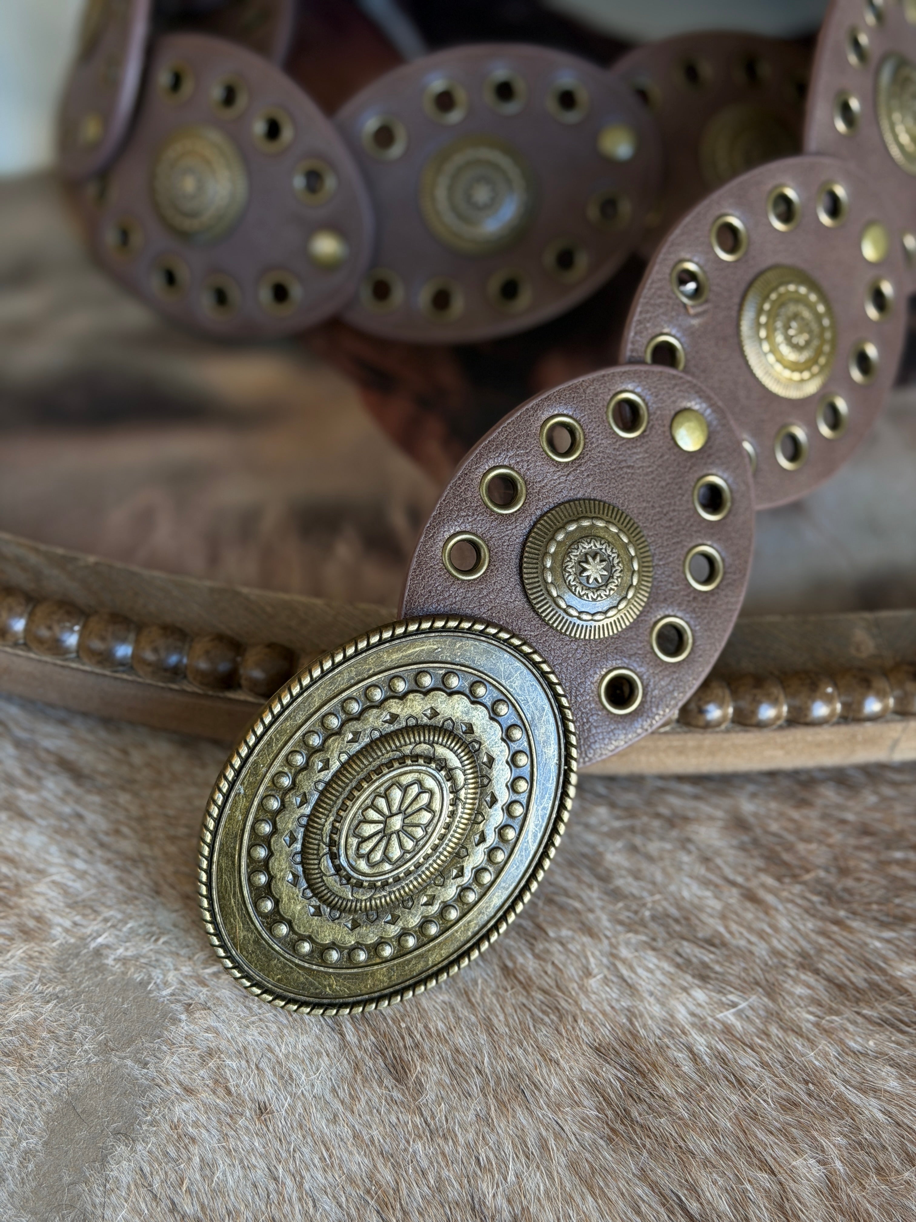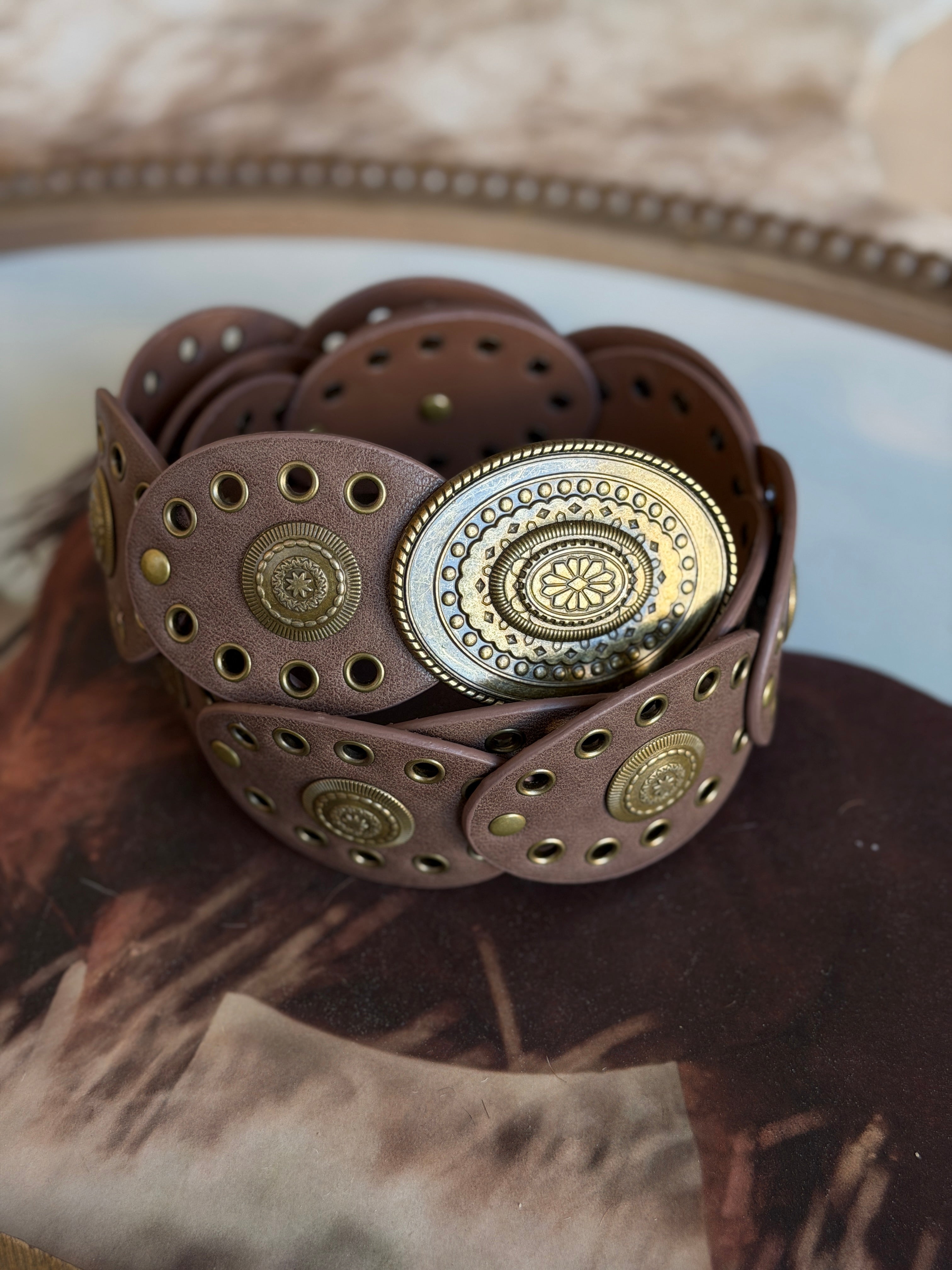 A rich brown statement belt crafted from linked oval leather discs with antique brass concho detailing. Designed to cinch the waist or sit low on the hips, it offers a true western-inspired look. The flexible linked construction allows for comfortable movement, while the oversized oval buckle grounds the piece with timeless, vintage character.