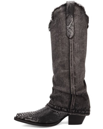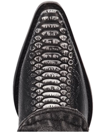 Make a fearless fashion statement with the Dingo Women’s Shabby Black Western Boots—a bold twist on western heritage with modern edge. Crafted with a distressed black denim shaft and a striking snake print vamp, these boots are the perfect blend of rugged and chic.