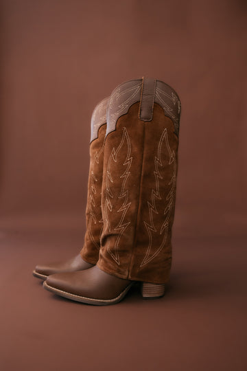 - Color: Cognac suede with leather cuff detailing