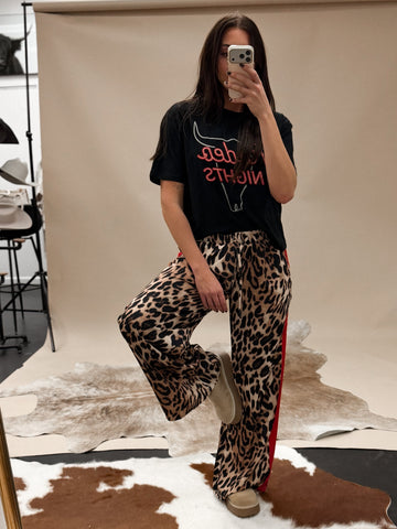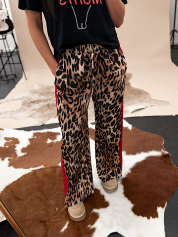 The Leopard Wide Leg Pants bring bold cowgirl energy with a touch of luxe comfort. Featuring a soft woven animal print and a striking red side panel.