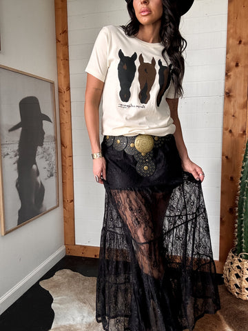 The Tiered Floral Lace Maxi Skirt in black is sultry western glam made easy. With tiered lace and a mini lining for coverage, this skirt takes you from casual rodeo wear to NFR fashion nights. Pair it with a sweater for fall, or dress it down with a graphic tee and boots for a cool-girl cowgirl outfit.