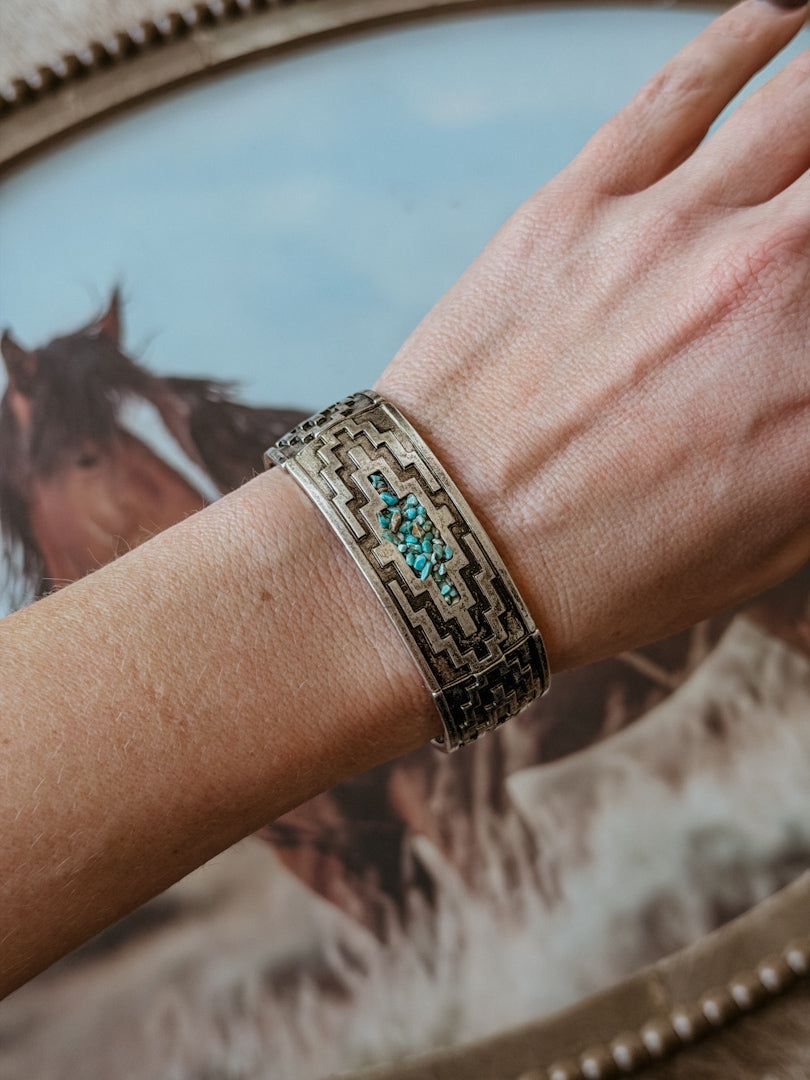 Crafted with faux turquoise beads in a classic chip style, it slides on easily and pairs beautifully with other bracelets or stands alone as a statement piece. Perfect for anyone who loves boho-inspired accessories with that timeless Southwest aesthetic.