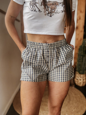 Borrowed from the boys, made for the wild. These plaid boxer lounge shorts blend laid-back comfort with just the right touch of tomboy charm. Designed in a navy and tan check, they feature a relaxed fit, high-rise elastic waistband, and a classic 3-button front detail. The side slits and pockets make them easy to move in—whether you’re running errands or lounging on the porch with your boots kicked off.