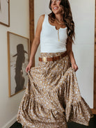 A flowy boho western maxi skirt designed for effortless style. This tiered floral skirt features a comfortable elastic drawstring waistband, side pockets, and lightweight fabric that moves beautifully with every step. A versatile piece the WILD J loves for rodeos, country concerts, and all weekend festivities!