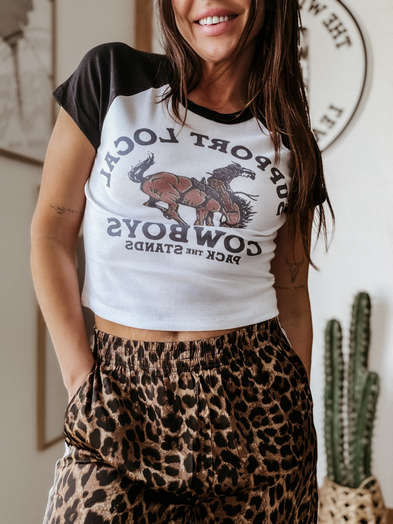 The WILD J is obsessed with this bold western graphic baby tee featuring a vintage-inspired bronc rider design and “Support Local Cowboys” graphic. Designed in a flattering stretch fit silhouette with contrast raglan sleeves, this fitted tee pairs perfectly with denim, boxer shorts, or leopard pants for effortless everyday western styling. A fun statement piece every western wardrobe needs.
