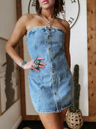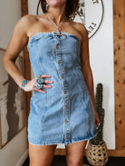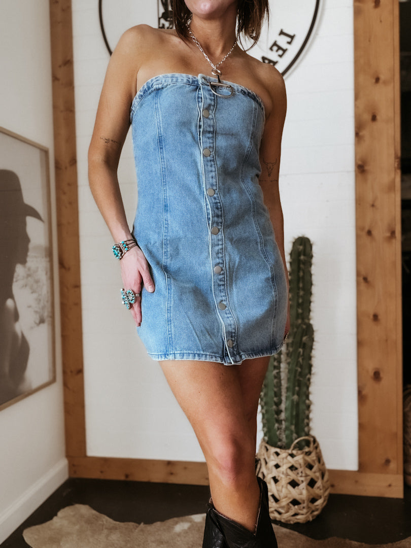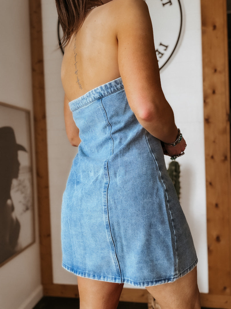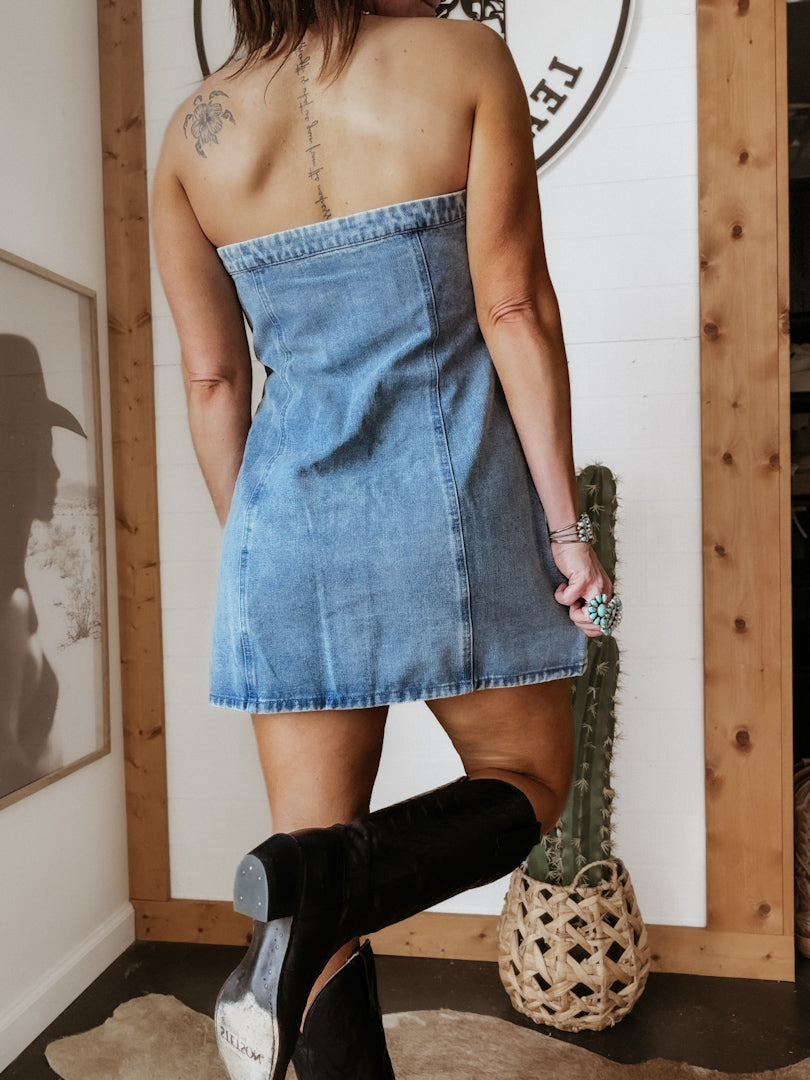 This is that throw-on-and-go piece that still turns heads — a structured strapless denim mini the WILD J would style on repeat. The fitted silhouette, vertical seam detail, and button front give it that clean, flattering shape that just works.