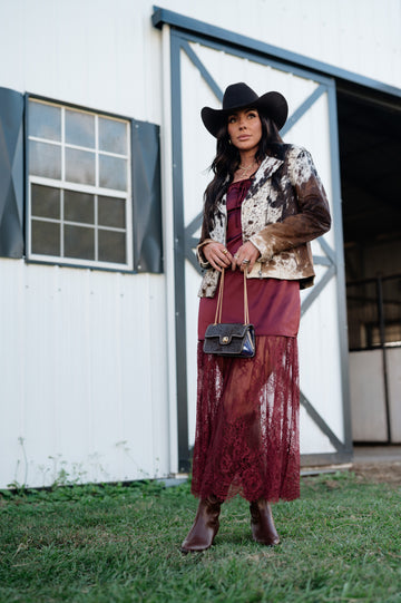 Wine-stained skies and western nights—this Burgundy Satin Lace Maxi Dress is made for romantic nights under the stars. With a luxe satin top, flirty lace hem, and delicate bow tie front, it’s effortlessly feminine with just the right amount of spice. Style it with boots and turquoise for a stunning date night look or holiday western glam.