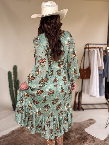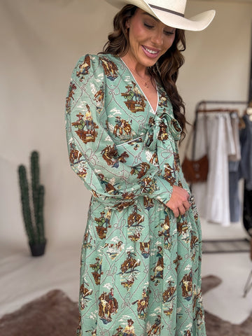 Your style tells a story. Inspired by the vivid artwork of A.R. Mitchell—one of the most iconic pulp novel illustrators of the American West—this dress is a wearable work of art. His storied prints come to life against an era-true mint green backdrop, trimmed with crisp white piping and tailored into a flattering vintage silhouette. Slim through the bodice with a full, gathered skirt and elegant sleeves, this piece blends romance, grit, and western heritage.
