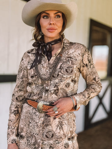 Boots may do the walking, but this dress does the talking. A Western fashionista’s dream, adorned with beautiful pearl snap buttons all down the front, with side slits and - of course - pockets. A timeless design that makes a bold statement in both comfort and style.