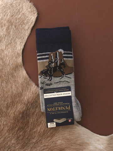 A premium everyday sock with a Western soul. These Pendleton merino crew socks blend softness, durability, and quiet luxury—finished with a subtle desert cowboy scene that nods to life on the open range. Lightweight yet insulating, they’re designed for year-round comfort whether you're running errands, headed to the ranch, or slipping them under your favorite boots.