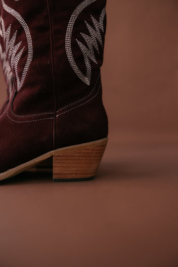 Saddle up in standout suede. These Maroon Suede Embroidered Western Cowgirl Boots are the perfect mix of bold color and timeless cowgirl detail. Featuring soft premium suede with contrast white western stitching, they bring instant western energy to any outfit—from dresses to denim. A stacked 2” heel gives just the right lift, and the pull-on tabs make them easy to slide into and hit the road.