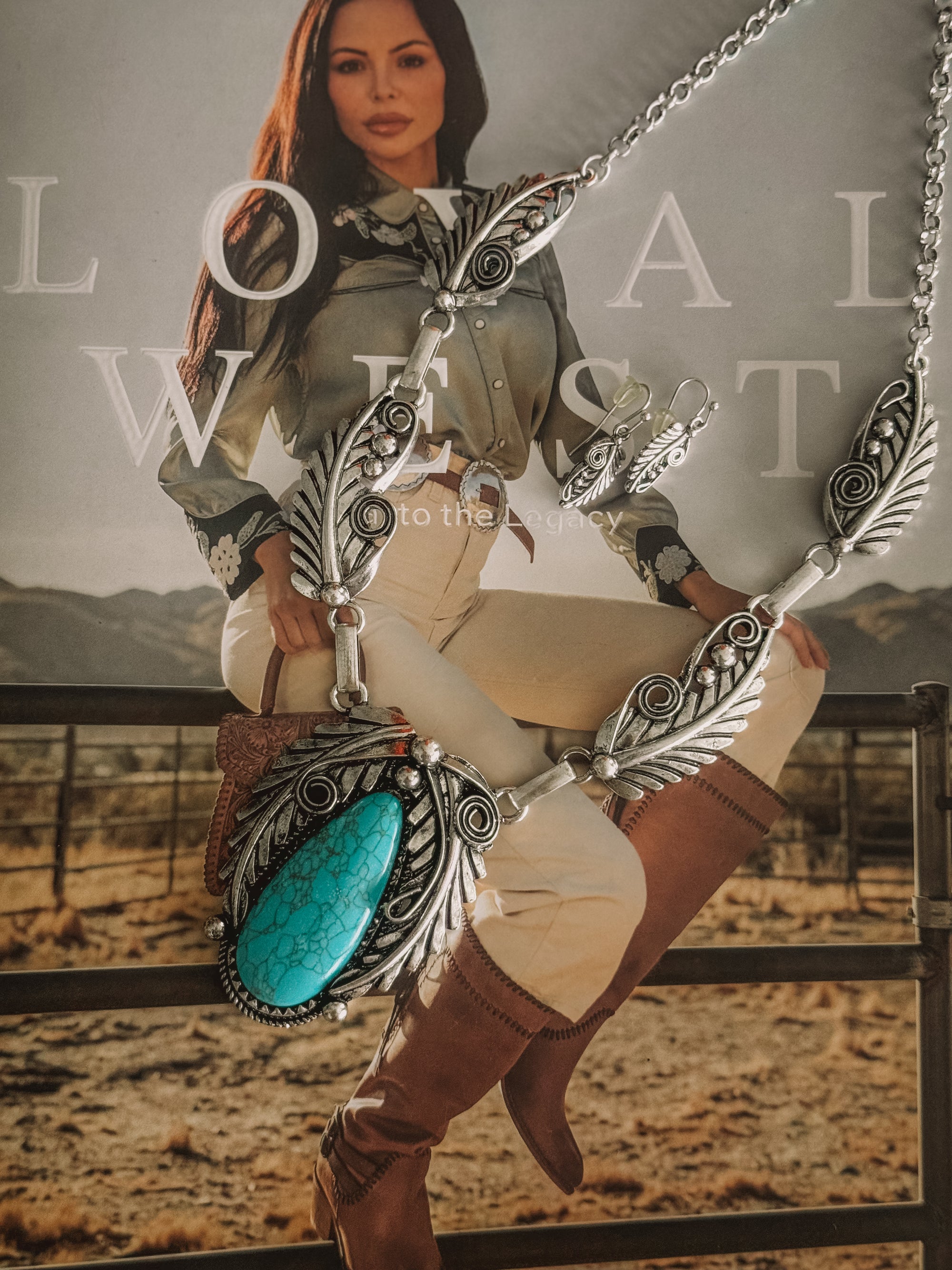 The Santa Fe Necklace is a must-have for any fashion-forward individual looking to add a touch of Western chic to their wardrobe. With its burnished silver and turquoise color and intricate feather stone design, this necklace and earring set is the perfect statement piece. The necklace measures 17 inches with an extra 3 inch extender, ensuring a comfortable and precise fit. Upgrade your style game with this stunning necklace set.