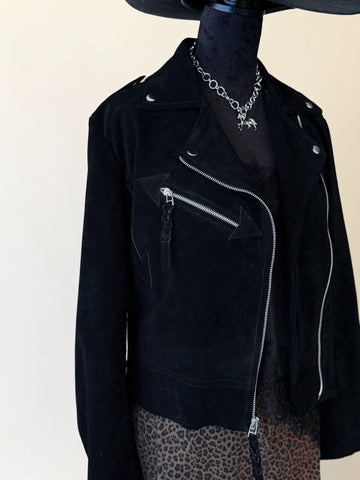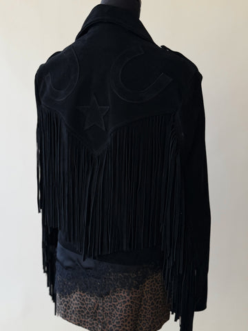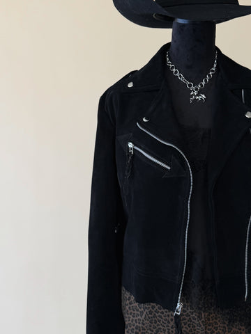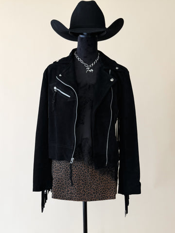 The Cowgirl Retro Biker in black suede is bold, timeless, and built for the spotlight. With silver hardware, hand-cut horseshoe and star appliqués, and braided leather pull ties, this jacket brings that rock ‘n’ rodeo energy straight to NFR fashion. Crafted in our heaviest suede that softens into buttery perfection with wear, it’s the ultimate mix of edge, luxury, and western soul.