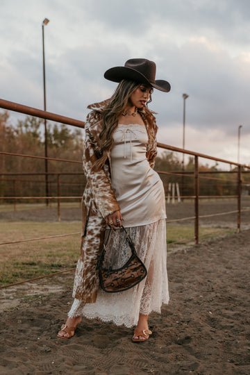 The Cowhide Trench Coat in camel is the definition of western luxury. Crafted from genuine cowhide leather, each piece is completely unique — no two patterns are ever the same. With its sleek silhouette and fully lined interior, this one-of-a-kind coat turns every entrance into a moment. Equal parts runway and rodeo, it’s true statement outerwear for the wild ones.