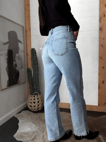 Looking for your next denim obsession? The Super High-Rise Light Wash Jeans are made for the modern cowgirl who craves structure, comfort, and a little edge. Designed in a light wash western denim with a flattering 12” rise and subtle slit detail, these jeans sculpt your waist while keeping your outfit effortlessly chill.
