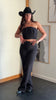 The Horse Bit & Luxe Set where business-class polish meets western edge. With its strapless cropped top and high-waisted chain-hook flare pants, this two-piece look is made for the spotlight — whether you’re headed to NFR events, Vegas dinners, or nights out that call for major cowgirl confidence.