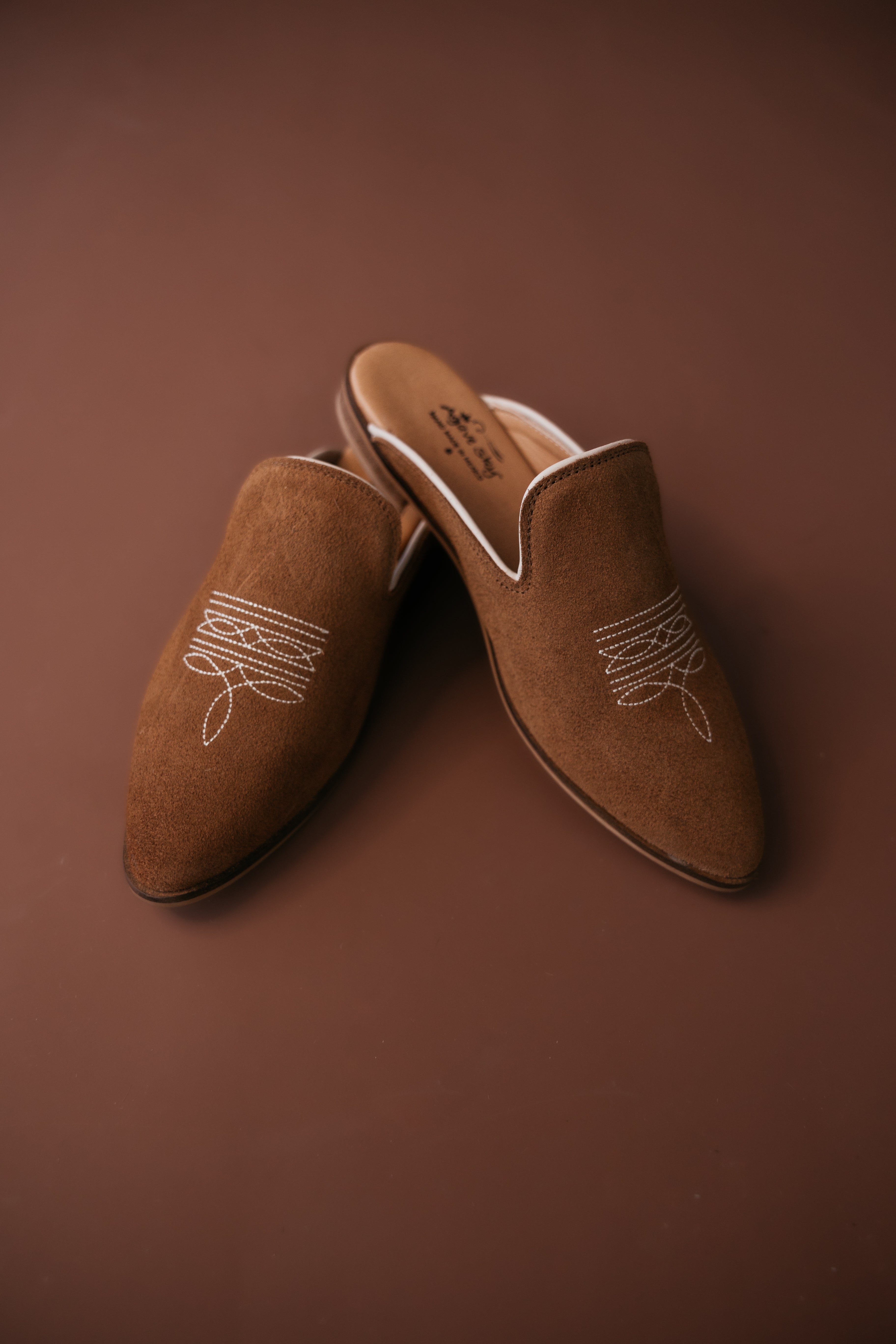The Adaire Honey Mules bring that sweet western charm in an effortless slip-on silhouette. Crafted in rich honey rough-out suede with classic cream boot-stitch embroidery, these mules blend comfort with authentic rodeo flair.