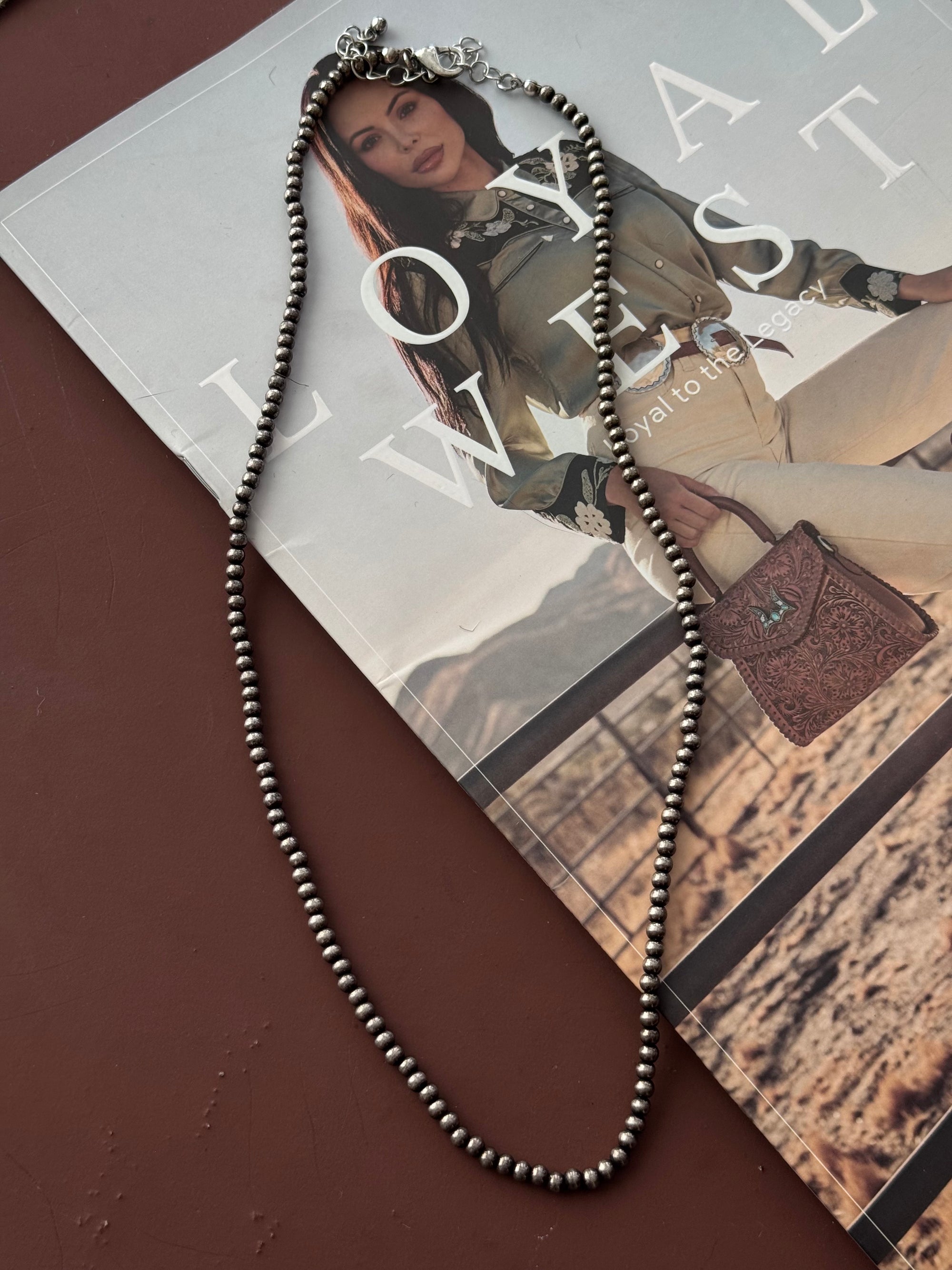 Pearled Necklace is the perfect lightweight layering strand. Designed with 4mm faux silver pearls, this mid-length piece adds subtle shine and western edge to any outfit.