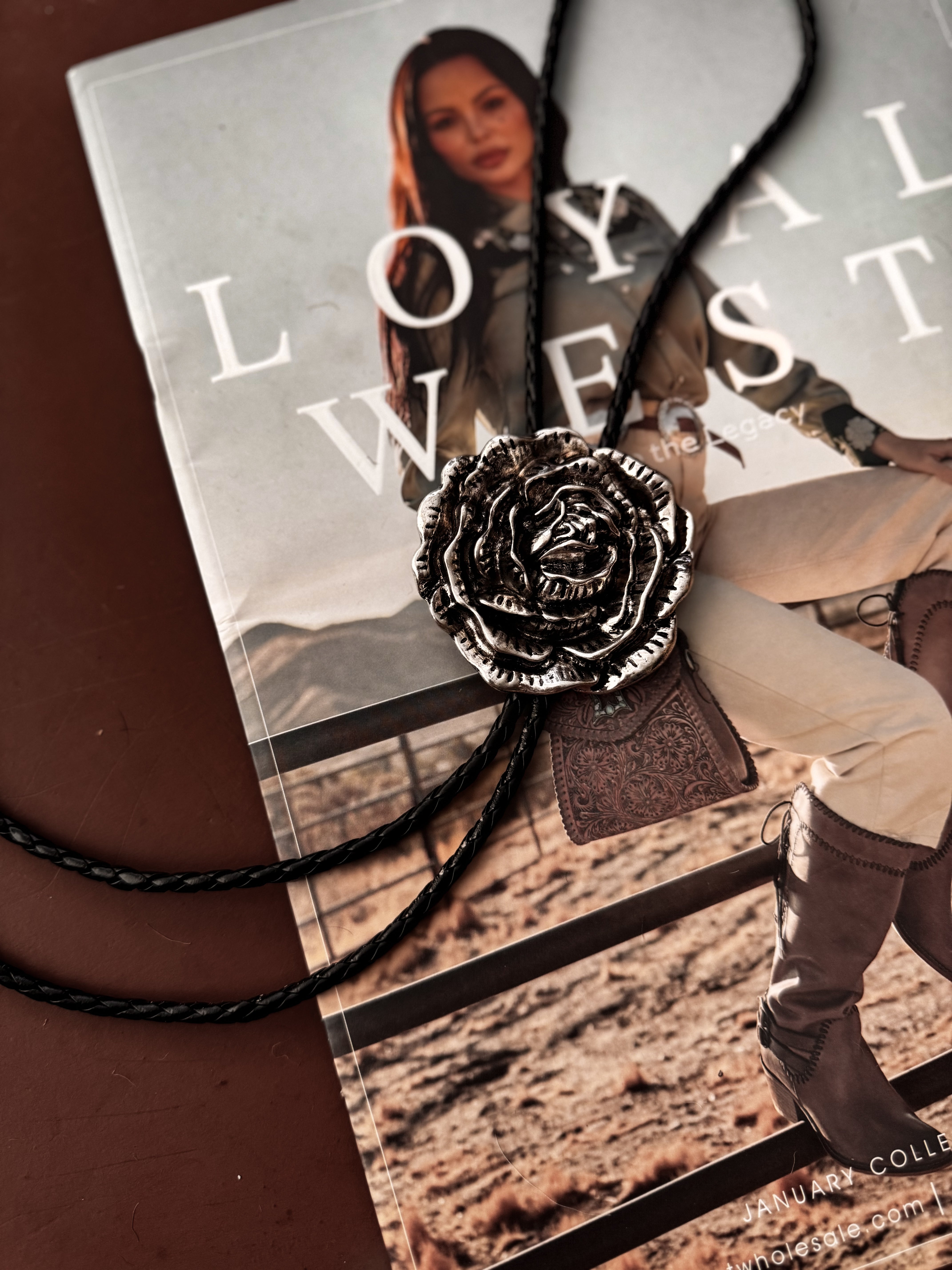 Classic bolo with a detailed rose concho, black braided cord, and silver tips. Adjustable slide—wear it with tees, blouses, or a blazer.