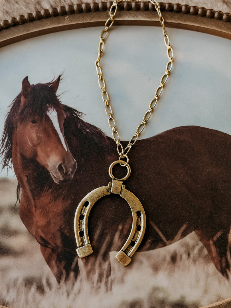 Bold, timeless, and rooted in western tradition — this is the piece that does all the talking. The oversized horseshoe pendant paired with an antique gold finish gives it that vintage western feel with a modern edge.