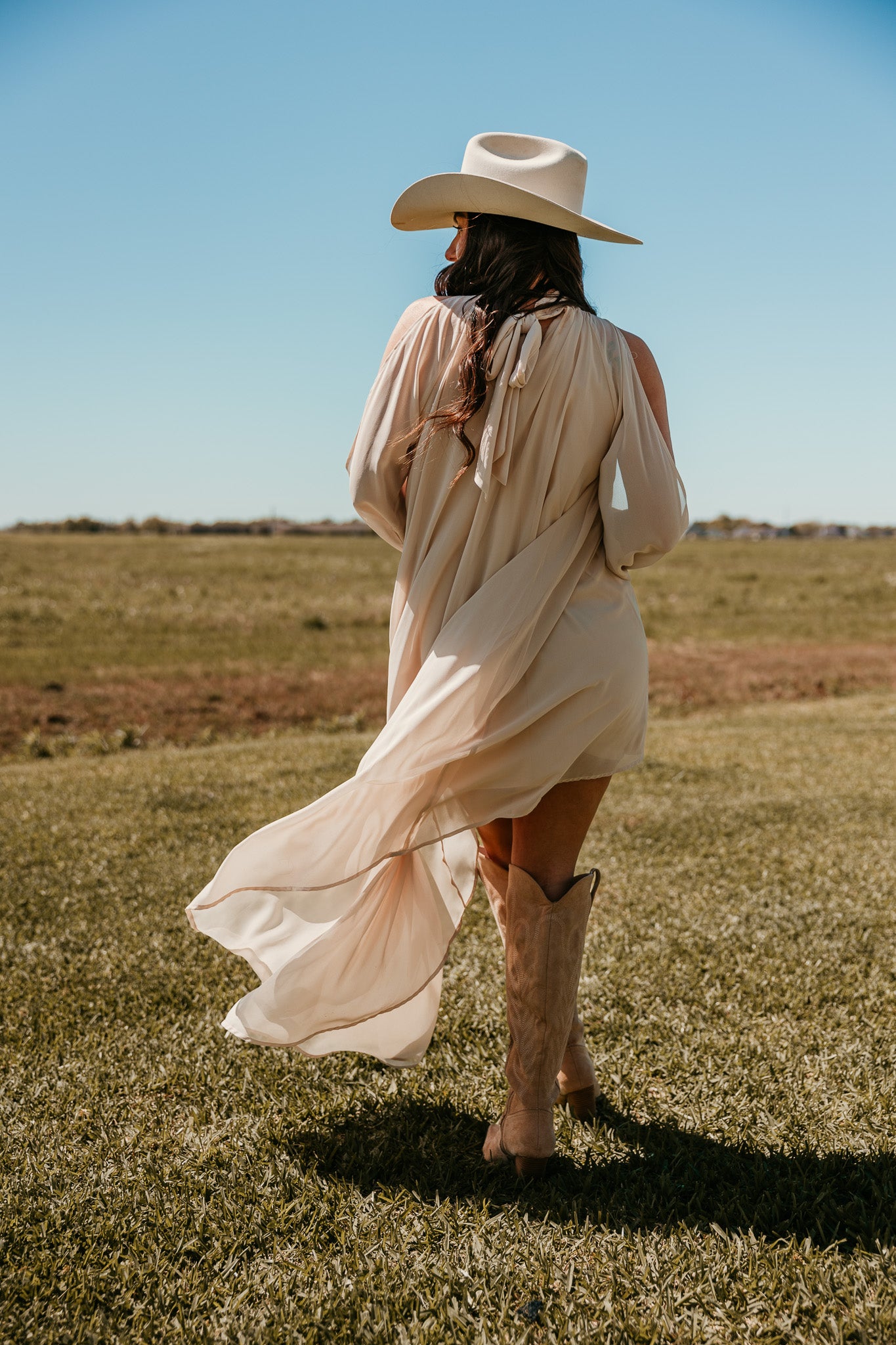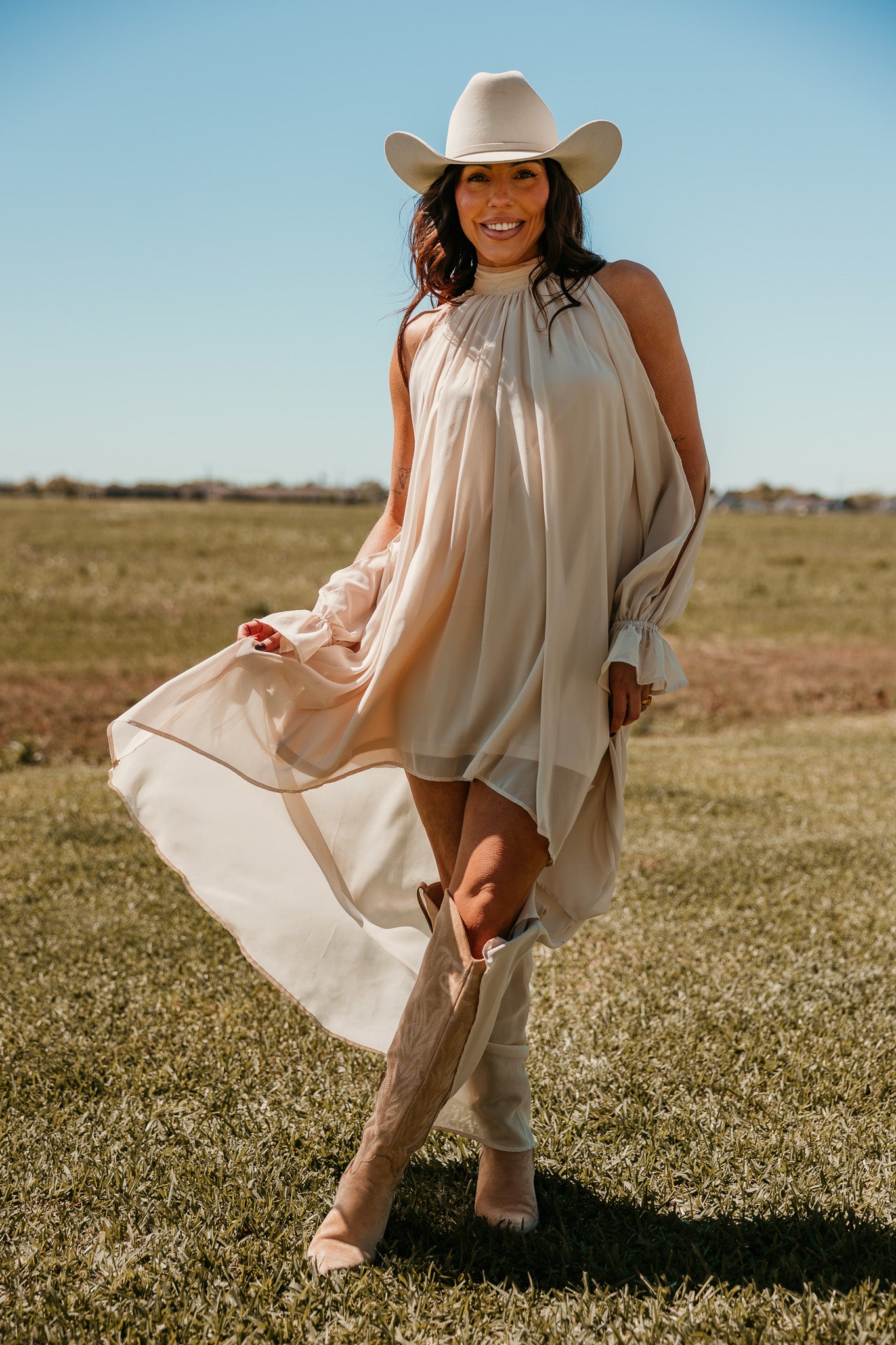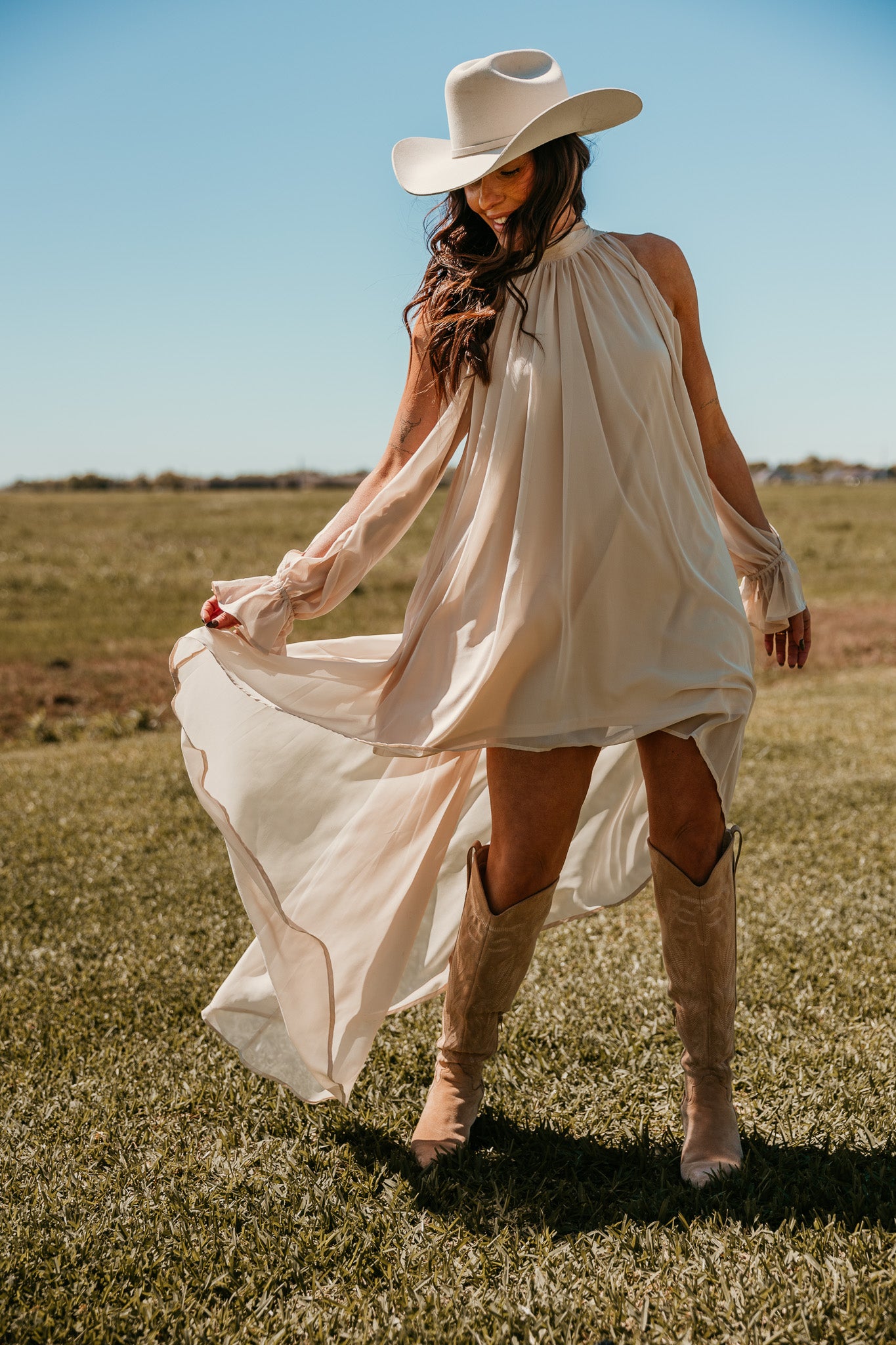 This champagne dress features a softly gathered neckline and a fluid high-low hem, creating effortless movement for western-chic outfits and elevated day-to-night styling.