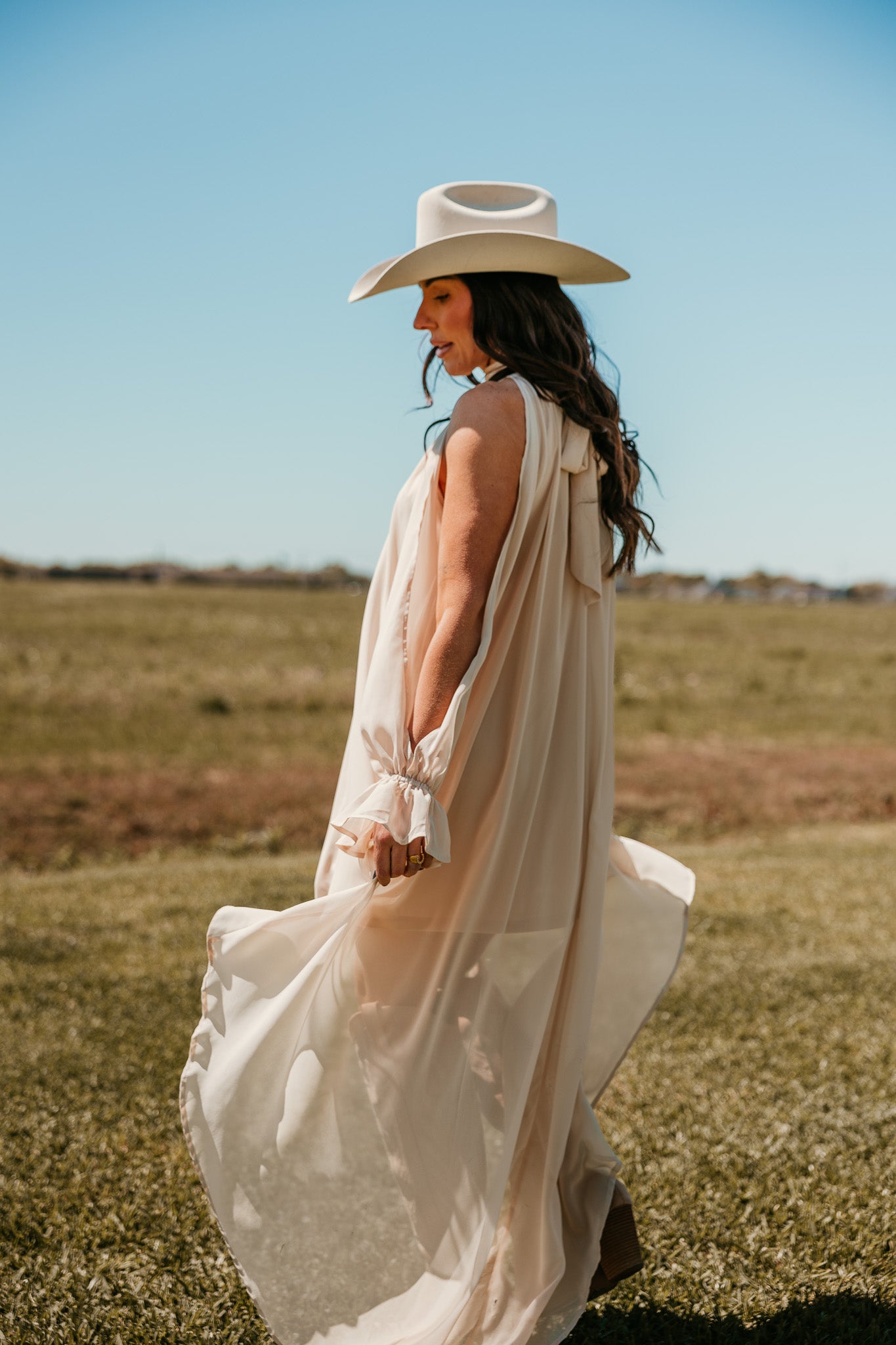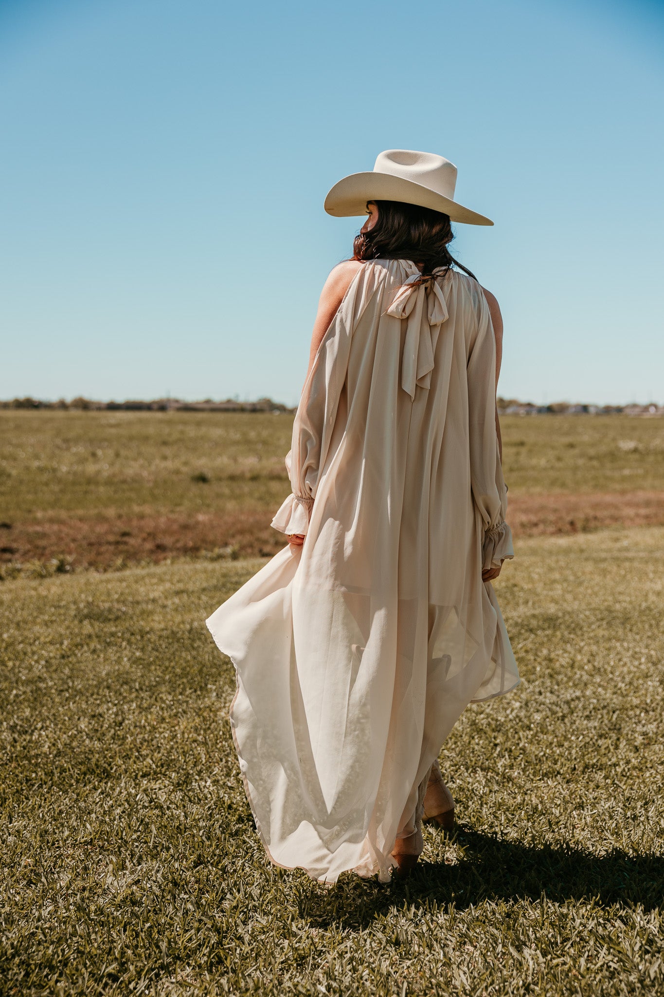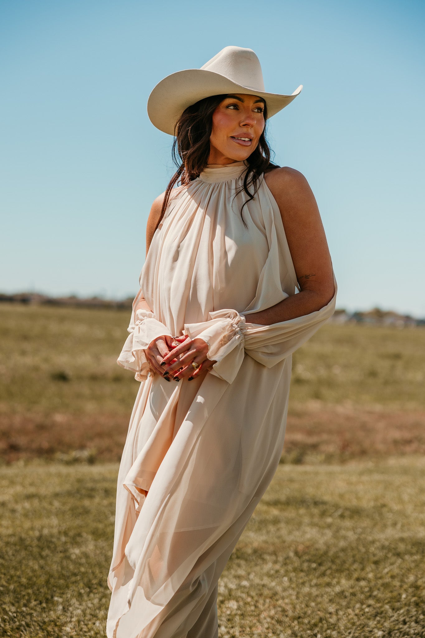 This champagne dress features a softly gathered neckline and a fluid high-low hem, creating effortless movement for western-chic outfits and elevated day-to-night styling.