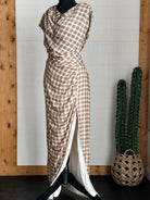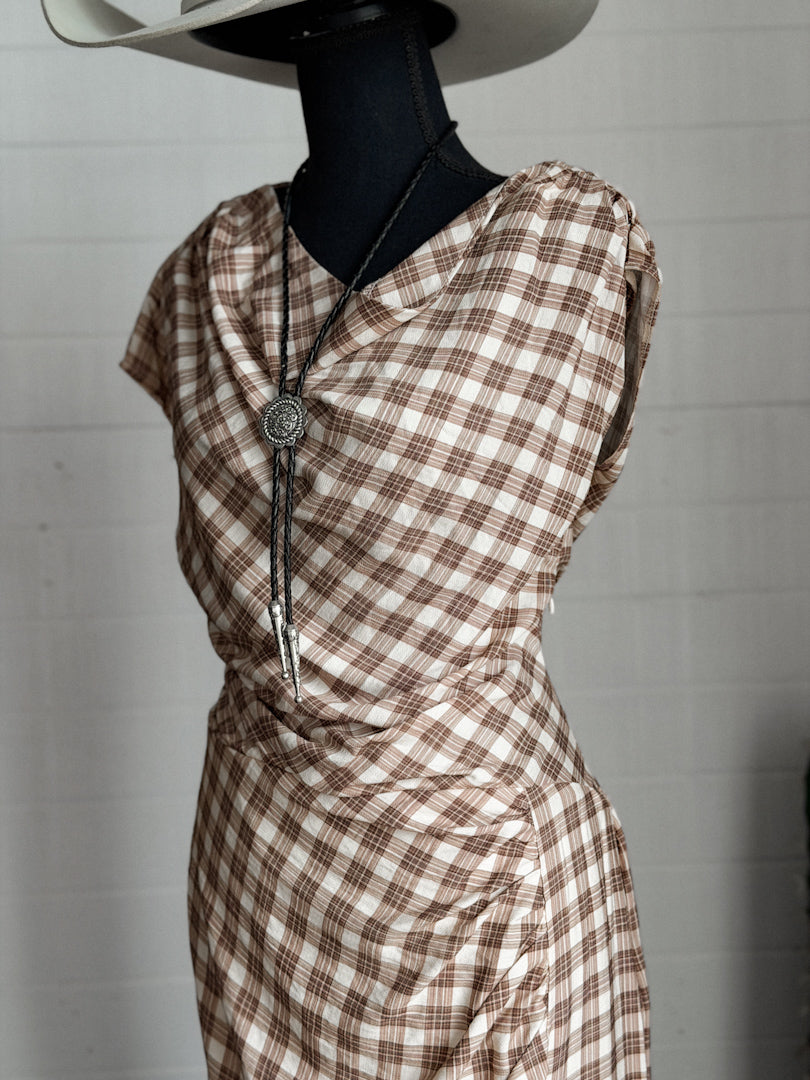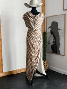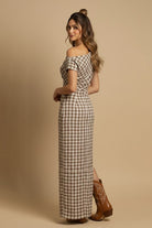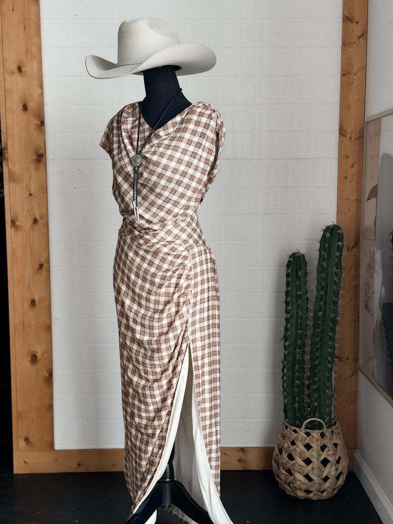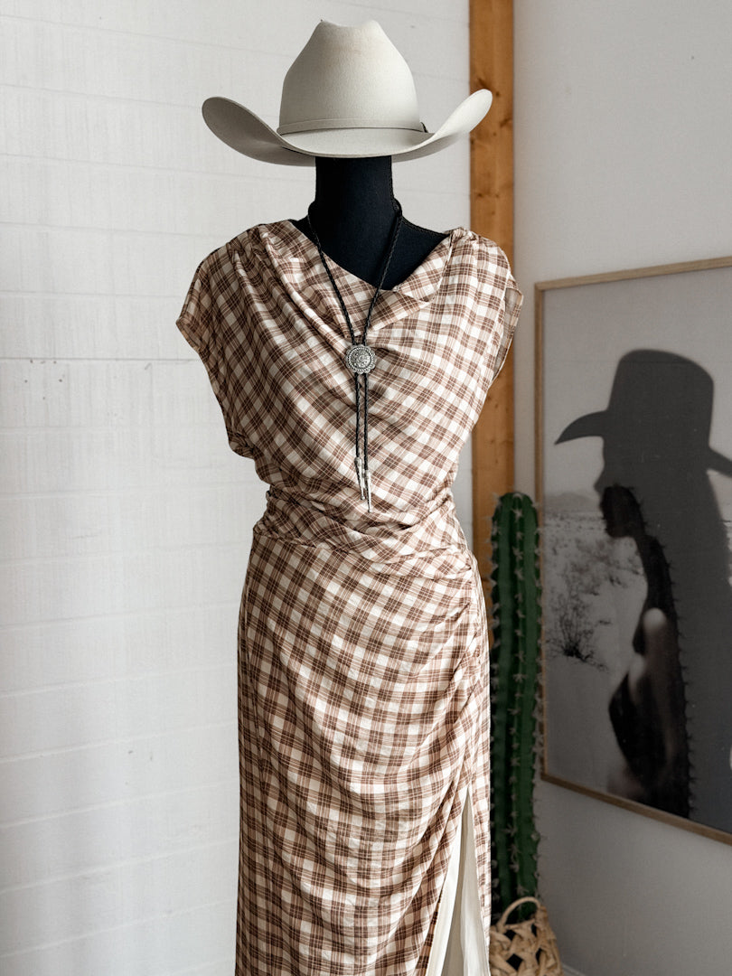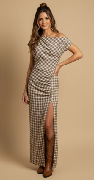 This body-skimming checkered maxi dress blends classic western charm with a modern silhouette — perfect for rodeo events, fall weddings, concerts, and elevated western-chic styling with effortless confidence.