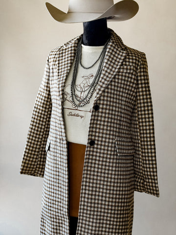 A longline trench coat cut in a classic plaid with tailored structure and everyday authority. Designed with a sharp lapel collar and clean lines, it brings a polished western edge without feeling stiff or formal. An easy layer that works across seasons and settings, from denim days to elevated looks.