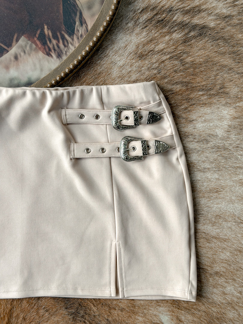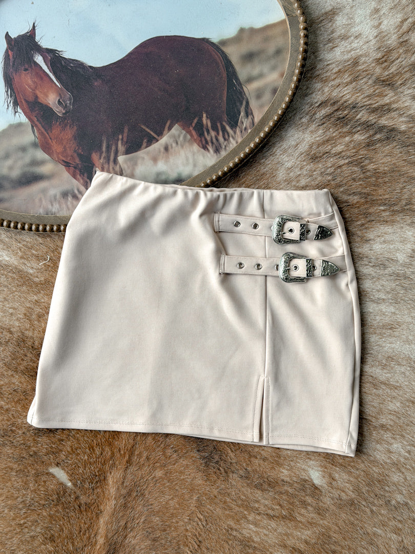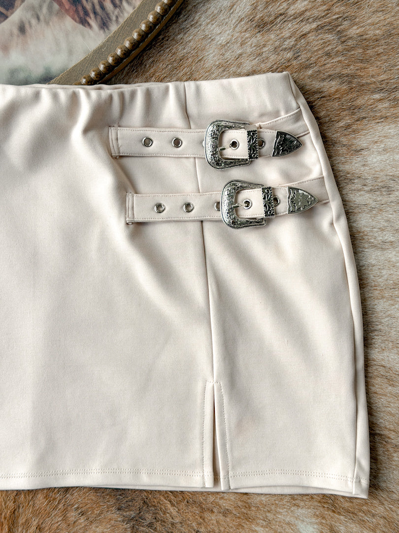 A modern western statement piece designed to elevate your everyday outfits. This ivory mini skirt features dual buckle strap accents and a subtle front slit for the perfect blend of western edge and feminine style. A versatile piece the WILD J loves for spring outfits, concerts, and effortless western styling.