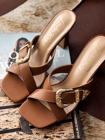 The Metallic Buckle Heels in tan blend western charm with modern edge. Featuring criss-cross faux leather straps and a silver engraved buckle, these heels bring just the right amount of polish to your rodeo outfit or night-out look. The cushioned insole keeps things comfy from day to night — perfect for NFR fashion moments or western cocktail events.