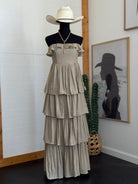 An effortless statement dress with soft movement and romantic texture. This strapless tiered maxi dress features a flattering smocked bodice and cascading layers that create a beautiful flowing silhouette. A timeless piece the WILD J loves for summer events, vacation nights, and effortless western-inspired styling.