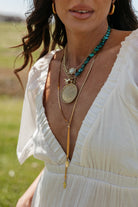 Natural turquoise scalloped coins meet artisan craftsmanship in this striking necklace. Featuring authentic 10mm turquoise pieces paired with a hand-hammered Indian brass shield, this piece blends bohemian elegance with timeless appeal. The warm gold tones complement the vibrant blue-green hues, creating a balanced, wearable statement. Perfect for layering or wearing solo, this necklace celebrates natural beauty and cultural artistry.