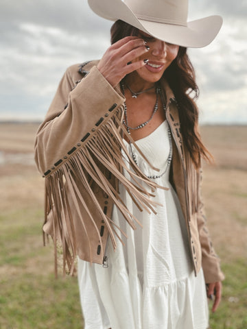 The Horseshoe Jacket in Dusty Sand is a wearable work of western art. Handcrafted by Dakota West Leathers, this wrist-to-wrist fringe jacket is made from buttery lamb suede and fully lined in a smooth silk print. Black leather accents, stud detailing, and custom horseshoe stitching add depth and edge to its iconic silhouette. Whether styled for a rodeo, concert, or editorial moment, this one is unforgettable.