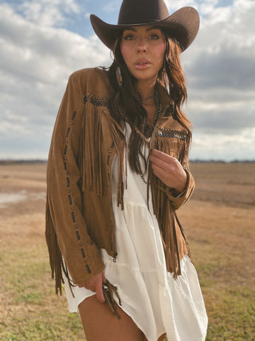 Say hello to timeless western luxury. The Horseshoe Jacket in Camel by Dakota West Leathers is crafted from ultra-soft lamb suede with full wrist-to-wrist fringe and a custom printed silk lining. Black leather lacing and hand-placed stud accents add contrast and edge, while the stitched horseshoe motif on the back brings a subtle nod to cowgirl heritage.
