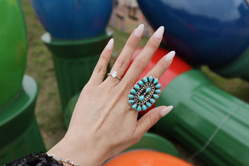 This beautiful handcrafted turquoise and sterling silver ring is the perfect addition to any western jewelry collection. With an adjustable size, it can be worn on any finger and features stunning stones and intricate details. Measuring 1 7/8 inches long and 1 1/4 inch wide, it is signed Nizhoni and stamped Sterling for authenticity. A truly exquisite piece of jewelry.
