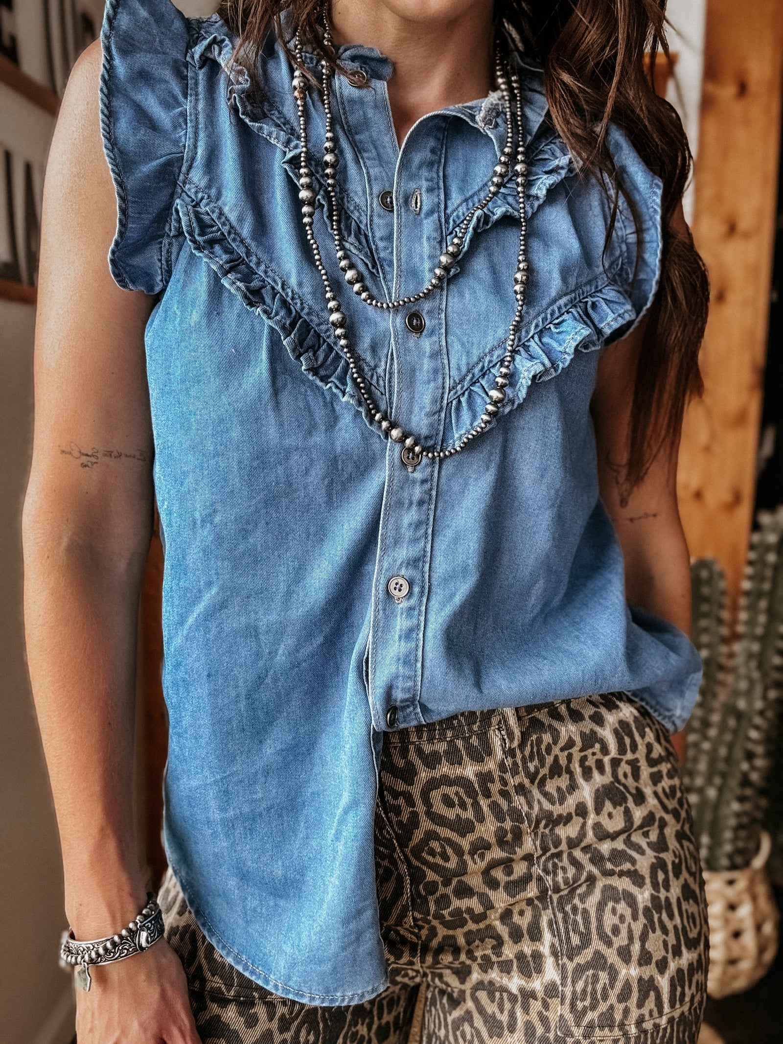 Sleeveless Ruffle Denim Blouse