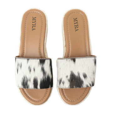 The Myra Cowhide Wedge Sandals are your new go-to for western flair with a bold edge. These handcrafted slides feature a luxe black and white hair-on cowhide strap paired with a woven jute-wrapped wedge sole—bringing effortless cowgirl energy to any outfit.