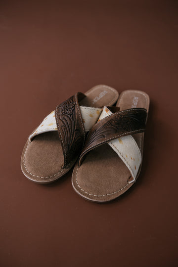 Say howdy to summer style with the Roper Delaney Tooled Leather Sandals. These slip-on cowgirl sandals combine genuine leather craftsmanship, hand-tooled floral straps, and bold hair-on-hide accents for a look as unique as you. Each pair features assorted hides—so no two are the same—while the cushioned footbed and lightweight rubber outsole deliver all-day comfort on ranch trails or coastal boardwalks. Pair these women’s western sandals with denim cutoffs, a graphic tee, and your favorite Stetson for an easy, free-spirit vibe.