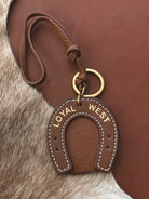 The Loyal West Horseshoe Bag Charm in tan calf leather brings a warm, rugged feel to your everyday style. This stitched leather charm is shaped like a lucky horseshoe and finished with a polished gold-tone keyring. Whether clipped to your favorite crossbody or slung on your keys, it adds just the right dose of cowgirl cool.