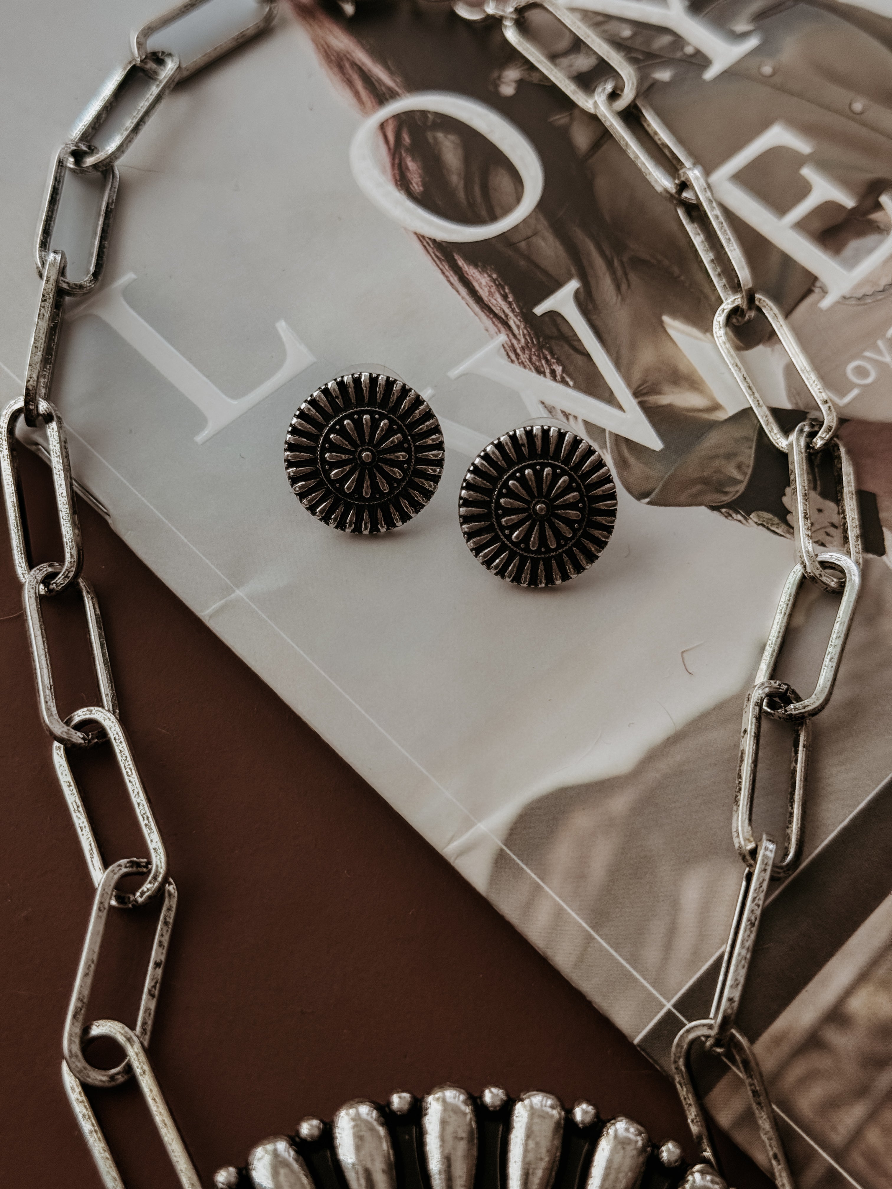 Make a bold entrance with this western concho jewelry set. Featuring a 15” chunky link chain with a 3” extender, this necklace is anchored by an oversized concho-style pendant that demands attention. Complete with matching concho stud earrings, it’s the ultimate statement set for any modern cowgirl.