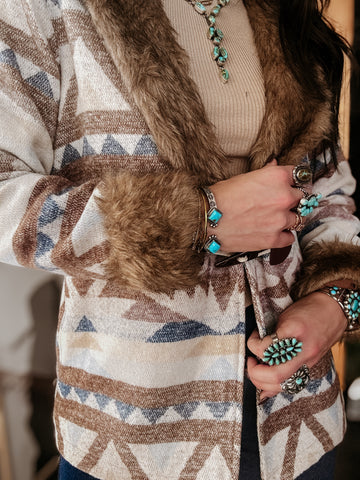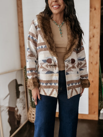 Channel western charm with the Belle of the West Fur Coat, a statement layer designed for style and warmth. Featuring an all-over Aztec-inspired print in earthy neutrals with blue accents, this coat blends rustic tones with a modern fit. The luxe faux fur collar and cuffs add texture and comfort, while the toggle closure and front pockets keep it practical and chic.